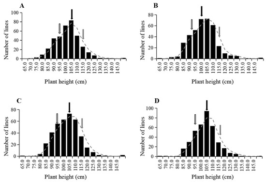 Phenotypic distribution of plant height in parental lines and RISLs in four environments. White, black, and gray arrows indicate Nei2B, R8006, and F1, respectively. (A–D) Years 2015, 2016, 2017, and 2018, respectively.