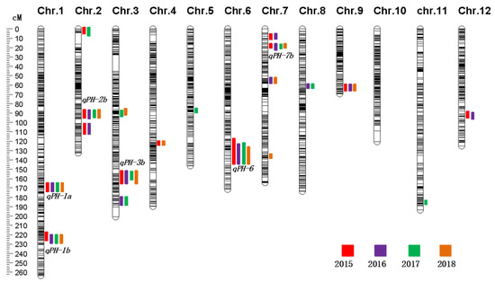 As a result of QTL mapping, a total of 19 QTLs for plant height were detected in the RISLs in four years, located on all the chromosomes except chromosome 10 (Figure 3, Table 2 and Table 3). Specifically, there were 12, 13, 12, and 11 QTLs detected in 2015, 2016, 2017, and 2018, respectively. In the four different environments, the detected QTLs explained 44.61–51.15% of the total phenotypic variation observed. With a LOD value of 2.51–15.30, each QTL showed a PVE of 2.08–14.05% and additive effects of 1.68–4.63, indicating the medium/minor effect for plant height in Nei2You No.6. Notably, 12 QTLs were inherited from R8006 and 7 from Nei2B, showing the abundance of positive plant-height factors in the restorer line. Six loci (qPH-1a, qPH-1b, qPH-2b, qPH-3b, qPH-6, and qPH-7b) were repeatedly detected over four consecutive years. The details are as follows.