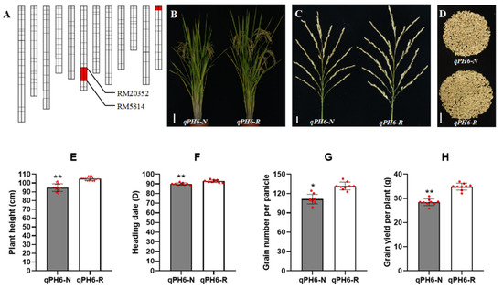 Scanning the universal core map with 512 markers, 131 polymorphics were obtained between Nei2B and R8006, among which there were only eight markers (RM20352, RM5814, RM6289, RM6770, RM6659, RM1126, RM5590, and RM2851) that were heterozygous in the F11 line 14Q13. Subsequently, for developing NILs of qPH-6, the markers RM20352 and RM5814 on the long arm of chromosome 6 were used to select the foreground, while RM6289, RM6770, RM6659, RM1126, RM5590, and RM2851 were used for background scanning in the MAS process. As a result, a pair of NILs, namely qPH6-N and qPH6-R, were obtained in the F15 progeny (Figure 4A). In detail, qPH6-N and qPH6-R showed the same genomes, except two segments on chromosome 6L and chromosome 12S and the target qPH6 located in the differential segment on the chromosome 6L flanked by RM20352 and RM5814. The NIL qPH6-R (104.77 ± 2.00 cm) showed an enhanced plant height that was 10.70% greater than that of qPH6-N (96.64 ± 4.46 cm), illustrating the stable existence of qPH-6 (Figure 4B,E). Additionally, qPH6-R had a higher yield than qPH6-N. A total of 2.89 days later than qPH6-N in heading date, qPH6-R could increase the number of grains per panicle and grain yield per plant by 21.87% and 18.50%, respectively (Figure 4F–H). These results indicate that qPH-6 is a stable QTL for plant height with pleiotropic effects on multiple agronomic and yield traits.