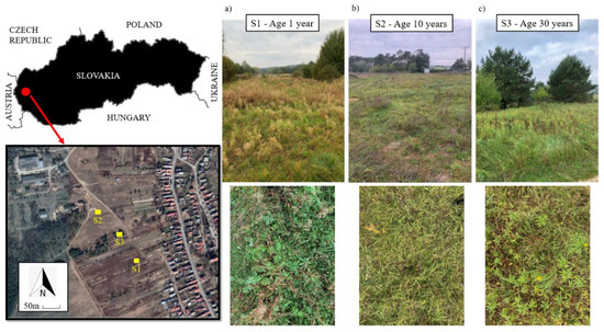 The experimental sites S1, S2, and S3 are located at Studienka village in the Borská nížina lowland (southwestern Slovakia) (Figure 1). The region has a temperate oceanic climate (Cfb) [33] with a mean annual temperature of 9 °C and means annual precipitation of 600 mm, which mainly occurs during the summer months. The soils of the Studienka sites are classified as Arenosol [34] and have a sandy texture [35]. The experimental sites were selected to include three different stages of secondary succession in relatively the same site conditions (climate, soil, and relief conditions). Plant nomenclature follows Marhold and Hindák [36].