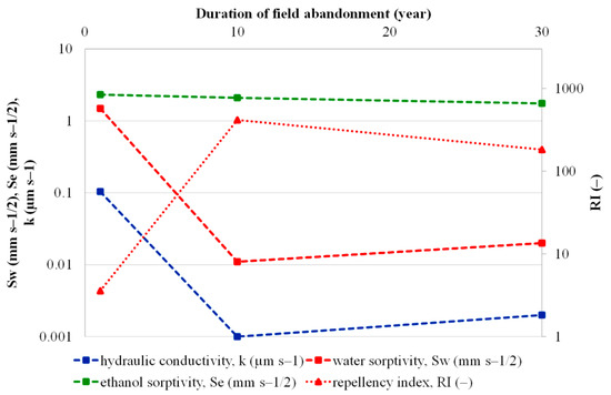 Relationships between hydraulic conductivity, k(−2 cm), water sorptivity, Sw(−2 cm), ethanol sorptivity, Se(−2 cm), and repellency index, RI, estimated in the top layer of acidic sandy soils, and duration of field abandonment at experimental sites S1, S2, and S3 located at Studienka village in the Borská nížina lowland (southwestern Slovakia). Note that both vertical axes have a logarithmic scale.
