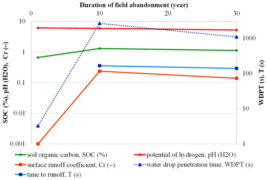The surface runoff coefficient, Cr, showed an increase between 1 and 10 years followed by a decrease between 10 and 30 years of abandonment, i.e., a course similar to the WDPT dependence on the duration of field abandonment. The time to runoff, T, did not change significantly between 10 and 30 years of abandonment, and it was not measured after 1 year of abandonment because no runoff occurred. The Cr vs. T relationship is presented in Figure 4 and described by the exponential model Cr = e−0.041(T−16.88), R2 = 0.69.