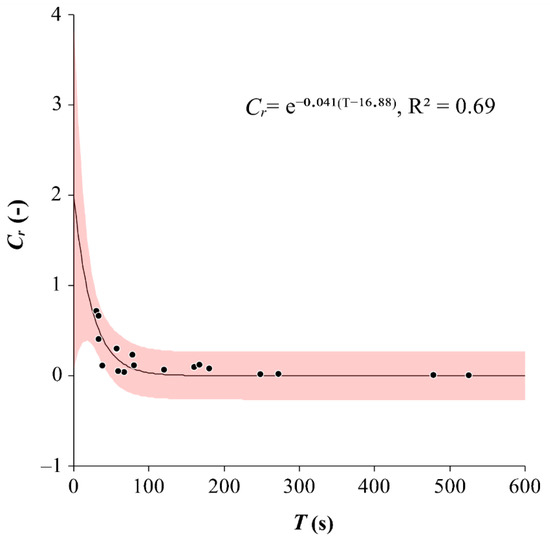 The relationships of surface runoff coefficient, Cr, vs. time to runoff, T, in sandy soil at experimental sites S2 and S3 at Studienka village in the Borská nížina lowland (southwestern Slovakia). (Black line—regression curve, red area—the upper and lower boundaries of a prediction interval at a specific value of T, black dots—measured values).