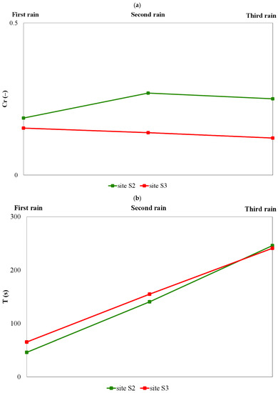 The surface runoff coefficient, Cr, and time to runoff, T, in sandy soil in a sequence of three consecutive rain events conducted at sites S2 and S3 at Studienka village in the Borská nížina lowland (southwestern Slovakia) are presented in Figure 5. At site S2, the surface runoff coefficient increased during the second rain in comparison with the first rain, and then slightly decreased during the third rain. At site S3, the surface runoff coefficient slightly decreased during the consecutive rains (first rain > second rain > third rain). The time to runoff increased monotonously during the consecutive rains (first rain < second rain < third rain) at S2 and S3.