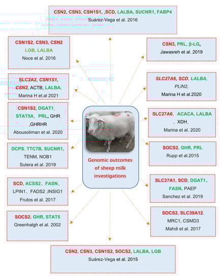 Genomic outcomes of sheep milk, including some potential genes generated from previous investigations of different researches. Repeatedly described genes are marked in red and green colors. Red indicates the significant genes SLC2A CSN2, SCD, and SOCS2, as discussed clearly in the text. Green indicates the genes detected that are important to milk traits in previous studies, but with little research.