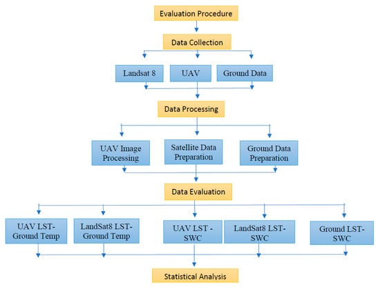 Remotely-sensed data are a source of rich information and are valuable for precision agricultural tasks such as soil quality, plant disease analysis, crop stress assessment, and allowing for better management. It is necessary to validate the accuracy of land surface temperature (LST) that is acquired from an unmanned aerial vehicle (UAV) and satellite-based remote sensing and verify these data by a comparison with in situ LST. Comprehensive studies at the field scale are still needed to understand the suitability of UAV imagery and resolution, for which ground measurement is used as a reference. In this study, we examined the accuracy of surface temperature data that were obtained from a thermal infrared (TIR) sensor placed on a UAV. Accordingly, we evaluated the LST from the Landsat 8 satellite for the same specific periods. We used contact thermometers to measure LSTs in situ for comparison and evaluation. Between 18 August and 2 September 2020, UAV imagery and in situ measurements were carried out. The effectiveness of high-resolution UAVs imagery and of Landsat 8 imagery was evaluated by considering a regression and correlation coefficient analysis. The data from the satellite photography was compared to the UAV imagery using statistical metrics after it had been pre-processed. Ground control points (GCPs) were collected to create a rigorous geo-referenced dataset of UAV imagery that could be compared to the geo-referenced satellite and aerial imagery. The UAV TIR LST showed higher accuracy (R2 0.89, 0.90, root-mean-square error (RMSE) 1.07, 0.70 °C) than the Landsat LST accuracy (R2 0.70, 0.73, (RMSE) 0.78 °C). The relationship between LST and the available soil water content (SWC) was also observed. The results suggested that the UAV-SMC correlation was negative (−0.85) for the image of DOY 230, while this value remains approximately constant (−0.86) for the DOY 245. Our results showed that satellite imagery that was coherent and correlated with UAV images could be useful to assess the general conditions of the field while the UAV favors localized circumscribed areas that the lowest resolution of satellites missed. Accordingly, our results could help with urban area and environmental planning decisions that take into account the thermal environment.