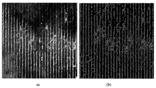The purpose of removing the soil background is to reduce the reflectivity of the soil background and obtain accurate canopy temperature data [31]. The Canny edge detection algorithm removed the soil background of the infrared thermal images of the farmland study area. The edge detection result of the denoised infrared thermal image using the Canny edge detection algorithm is shown in Figure 4. It can be seen that the Canny edge detection algorithm can accurately identify the boundary pixels between the crop canopy and soil background.