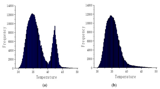 Histogram of the infrared thermal image temperature, (a) Temperature histogram of the raw infrared thermal image and, (b) Temperature histogram after removing the soil background.
