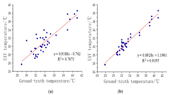 Comparison of the prediction accuracy of canopy temperature values with, (a) linear fitting results of the canopy temperature value from raw infrared thermal images and, (b) linear fitting results of the canopy temperature value from the infrared thermal images by Canny.