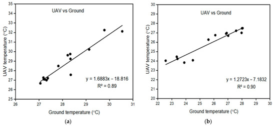 Relationship between the UAV-TIR sensor and the ground measurements, (a) DOY 230, (b) DOY 245.
