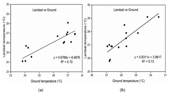 Table 8 shows the ground and Landsat 8 LST validation comparison results. The ground data was measured by the TCAV-L instrument, which was used to validate and evaluate the Landsat LST retrieval algorithm. When comparing the LST results to the ground measurements, there may be a 5 °C difference. The accuracy of the results in certain places was within 2 °C of the actual ground temperature that was proposed by Srivastava et al. [36]. As the resolution of Landsat 8 for the used band was 100 m for the thermal band, the comparison was made with the in-situ data, which is different and can often result in large variations. The extent of agreement, regression, and correlation were found for observation day. Hourly data were obtained from a local weather station and compared to the retrieved LST. Images from the satellite were downloaded based on the information that was available. One satellite image was downloaded on each of the two days (DOY 230 18 August and DOY 245 2 September). A total of two satellite images from two different dates were selected based on data that were available to compare the findings. For DOY 230, regression analysis indicated moderate results (R2 = 0.70) with the in-situ data, as shown in (Figure 8a). The correlation coefficient was 0.83 and showed a better relationship of both data. Similarly, in RMSE and MAE, 0.78 °C and 0.62 °C values were observed, respectively, indicating a lower degree of error between both datasets. Approximately no bias (0.08) was observed for the Landsat data, showing no over- or under-estimation of the data. Similarly, the reading of DOY 245 also went through statistical measures and showed similar behavior. Regression and correlation provided 0.73 and 0.85 values, respectively, indicating an appropriate response to the ground data (Figure 8b). RMSE and MAE was found to be a little higher (0.94, 0.81) than previous observations (0.78, 0.62). However, Landsat 8 slightly over-estimated the readings as per the results of bias. Overall, the results indicated the lower performance of satellite than UAV measurements either in terms of errors or correlation. The reason for the better performance of UAV comes from the pixel size and distance from the Earth because, in the case of satellite, many parameters are involved which influence the temperature retrieval.