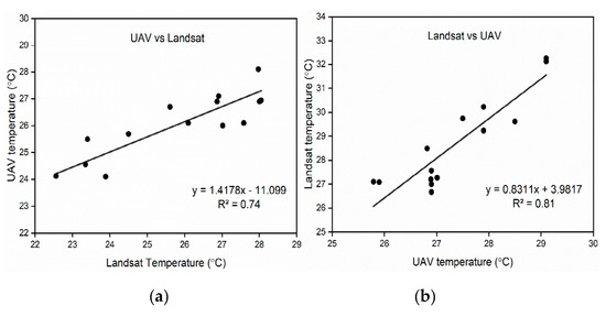 Landsat 8 and the UAV have thermal infrared sensors with their specific ranges as given in Table 2 and Table 3. Table 9 shows the comparison results of Landsat 8 and the UAV data retrieval. A comparative study was also taken under consideration to understand the detection relationship between both platforms. The temperature that was measured by Landsat 8 and the UAV was analyzed through statistical performance measures to find correlations between them. Based on the regression analysis (R2 = 0.74) and correlation coefficient (0.85), a reasonable extent of agreement was detected for DOY 230 (Figure 9a). On the other hand, the results (R2 = 0.81, CC = 0.90) that were attained on DOY 245 also showed promising results between both sensors (Figure 9b). The RMSE and MAE were found 1.09 °C and 0.89 °C for the reading of DOY 230, while it goes higher to 1.67 °C and 1.35 °C for DOY 245, respectively. The bias estimated that its value goes to a maximum of 1.65, indicating an overestimation for field area as shown below the table.
