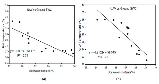 Soil moisture (SM) is an essential component of the Earth’s surface water balance, energy balance, and regulating the land surface temperature (LST). The relationship between LST and the available soil water content (SWC) was also observed. Thermal sensors with high resolution captured images by UAV help understand these variables relationships on a temporal basis. To understand the association between both quantities, regression and correlation were performed. The results suggested that the UAV-SMC correlation was negative (−0.85) for the image of DOY 230, while this value remained approximately constant (−0.86) for the DOY 245 as well (Figure 10a,b). The negative value indicates an inverse relationship between the moisture and soil temperature for a few hours per day. Previous studies in this field examined SM temporal evolution and reported its persistence for a few hours per day and even for a few days [37]. Points where the higher temperature represents lower moisture levels and lower temperatures have a higher moisture level. The results that were obtained by regression analysis were also suitable for UAVs ranging between 0.74–0.72, which also enforced the relationship between the variables.