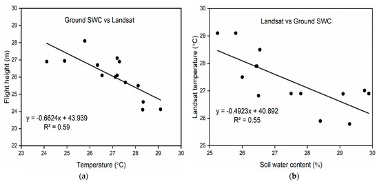 The Landsat 8 satellite had the thermal band to capture high-resolution thermal images, which have been used in this study to estimate land surface temperature. Although the satellite images do not have as high a resolution as the UAV sensors, they provide satisfactory ground temperature results. Therefore, such a technique can be used for larger field areas. However, to understand the surface temperature retrieval ability of Landsat 8, the ground measurement was taken. Regression and correlation analysis were applied to both images to understand the relationship with soil water content (Figure 11a,b). The research showed a lower value of R2 (0.59, 0.56) for both images, indicating a lower agreement of temperature detection with SWC. Likewise, the UAV negative correlation coefficient (−0.74, −0.76) showed an inverse relationship between both the variables. Although satellites do not perform much better than UAVs, they could be more promising for larger areas with less human resources and economic expenditure.