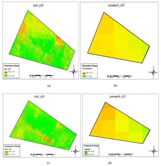 LST orthomosaic images between the UAV and Landsat 8, (a,b) DOY 230, (c,d) DOY 245.