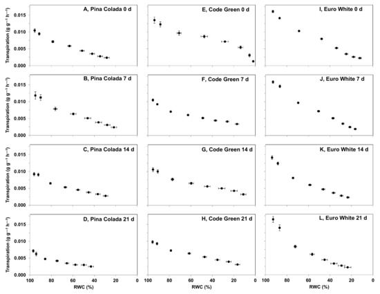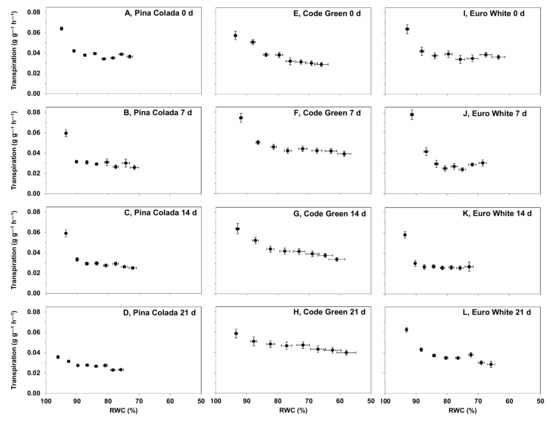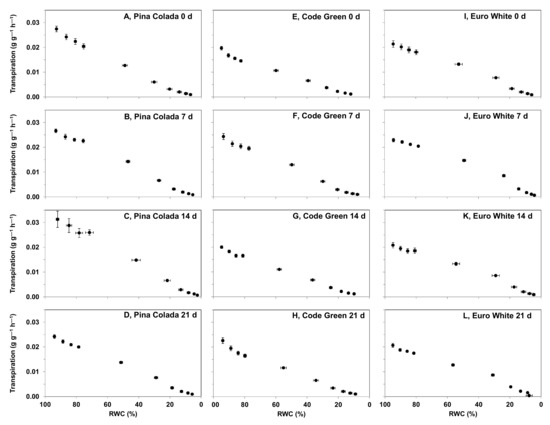 | Cultivar | Storage Period (d) | Cumulative Transpiration (g g−1) | Decrease in Transpiration (%) | RWC (%) | ||||||