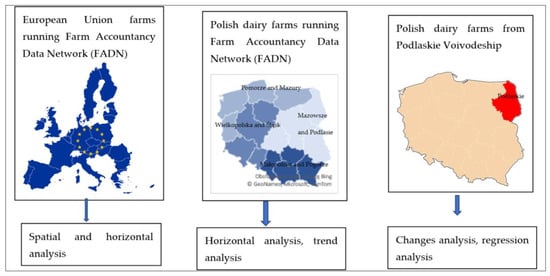The results were presented in descriptive, tabular, and graphic forms. The research was multi-level: on a macro scale it included the EU countries, Poland, individual states, and dairy farms keeping Farm Accountancy Data Network (FADN) accounting. On a micro scale, it included a sample of farms that carried out investments and received EU (European Union) support (Figure 1).
