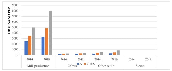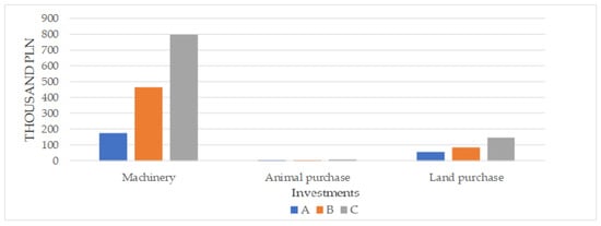 The second research hypothesis, H2, assumed that the investments made in farms improved their economic situation. This was positively verified. This is evidenced by the calculated results of agricultural income in the research farms, both in total and per one hectare of agricultural land on the farm, as well as per one fulltime job on the farm. In the group A farms, the income from an agricultural holding increased by 66.5% per one hectare of agricultural land, and by 12.6% per one fulltime job per farm; it increased by 54% in 2014–2019. In the group B farms, income from a family farm increased by 69.5%, income from a family farm per one hectare of agricultural land increased by 30%, and income from a family farm per one fulltime job on a farm increased by 65% in the same period. The highest increase in the researched income indicators were observed in the farms from group C. They increased their family farm income by 124.7%, as well as their family farm income per one hectare of agricultural land by 68.5%, and their family farm income per one fulltime job on a farm by 102.5% in 2014–2019.