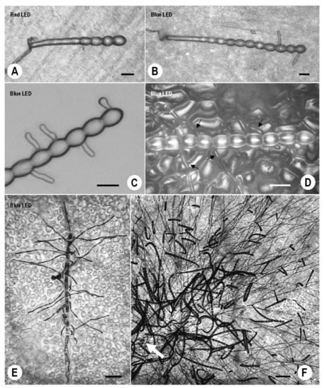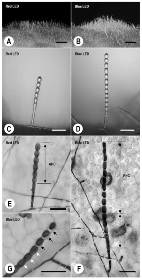 2.3. Microscopic Observation of Conidiophores in KMP-6N Colonies under Red or Blue LED Irradiation