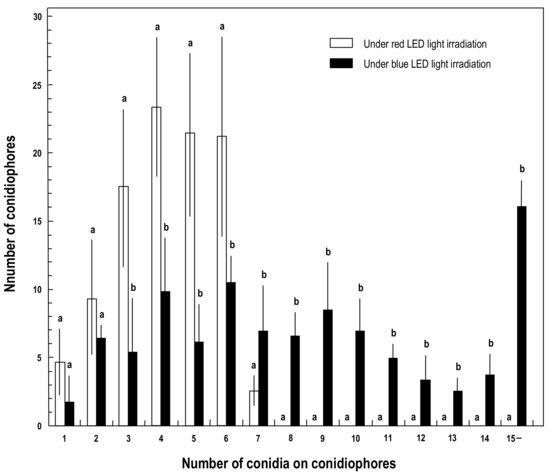 Frequency distribution of conidiophores with different numbers of conidia under red and blue LED irradiation. Conidiophores were counted in 12-day-old KMP-6N colonies, incubated for 10 days under growth chamber conditions and then for 2 days under red or blue LED irradiation. The numbers in the axis mean the number of conidia piled in chains on conidiophores. KMP-6N did not pile more than eight conidia in chains on conidiophores under red LED light irradiation while more were piled under blue LED light irradiation. Data are means ± standard deviations (SDs) of five replicates. Different letters (a and b) indicate significant differences (p < 0.05, Tukey’s test).