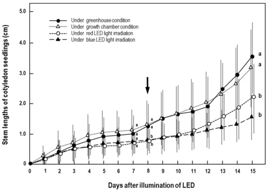 Continuous changes in melon seedling development from the cotyledon to three-true unfolded leaves stages during irradiation under red or blue LEDs. Melon seedlings grown under greenhouse and growth chamber conditions were used as controls. Stem length was measured repeatedly in the same melon seedlings treated under each condition for a period of 15 days. The black arrow indicates days showing significant differences in melon seedling growth among the four seedling groups. Data are means ± SDs of five replicates. Different letters indicate significant differences (p < 0.05, Tukey’s test).