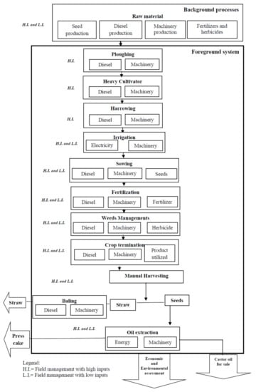 The analysis of the environmental impacts related to castor oil production was performed, applying the life cycle assessment methodology (LCA) according to UNI EN ISO 14040 e 14044: 2006 [39,40] and following an attributional approach [25,41].