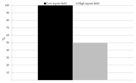 The carbon footprint of the two different fields management (FU = 1 ha−1). The values are expressed as percentages in relation to the field management with the greatest environmental impact, which is expressed as 100%.