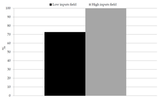 When a sensitivity analysis is performed by switching the functional unit from 1 Mg of oil to 1 hectare, the findings change. In fact, comparing GHG emissions deriving from high-input and low-input management systems, the latter exhibits 27% lower emissions (Figure 4). These results are consistent with the current literature [25,27] where the switching of the functional units capsizes the findings. The findings, as expected, were due to different agricultural phases considered for each scenario (see Figure 1). In fact, in a low-inputs system the emission was 878 kg CO2 eq.; under high-inputs management, it reached 1210 kg CO2 eq.
