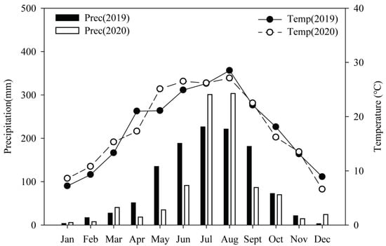 Temperature and precipitation of Zhongjiang County during the study period in 2019 and 2020. Note: Prec, Total monthly precipitation (mm); Temp, Average monthly temperature (°C).