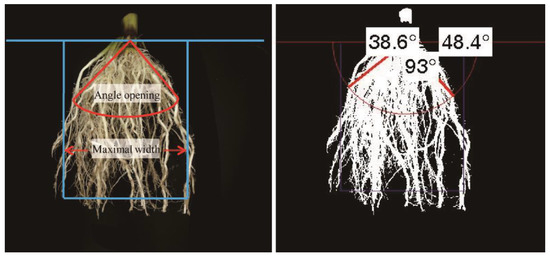At silking and physiological maturity stage, three uniform plants from each plot were cut at the soil surface and separated into leaves, stem and grain (only at maturity). At the silking stage, roots were excavated within a soil volume of 30 cm (length) × 30 cm (width) × 25 cm (depth) for each plant and were then shaken off a large fraction of the soil adhering to the root system. Afterward, the roots were washed under low pressure using a water hose and nozzle. Root imaging and processing were as described by Colombi et al. [21]. Briefly, root images were captured in the imaging tent using a digital camera (Canon EOS 400D, Canon, Tokyo, Japan) with a 35 mm fixed focal lens (Canon EF 35 mm f/2.0, Canon, Tokyo, Japan). The image size was 35 × 52.5 cm resulting in a pixel size of 0.13 mm. Root images analyses were processed using REST software (Figure 2). RSA traits, including total root length, surface area, angle opening, and maximal width, were quantified in this study.