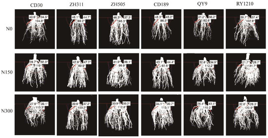 The root angle opening and width between genotypes were significantly different. Under three N treatments, CD30 and RY1210 had larger root angles, CD189 and QY9 showed smaller ones, while ZH505 had a larger root width at N150 and N300, respectively. However, the change in root width was not completely consistent with the root angle. Under three N treatments, CD30, ZH505 and RY1210 had larger root widths, while QY9 had a smaller root width.