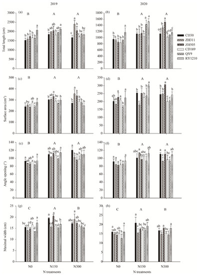 Root total length, surface area, angel opening, and maximal width of six maize cultivars under three N treatments in 2019 and 2020: (a) root total length in 2019, (b) root total length in 2020, (c) root surface area in 2019, (d) root surface area in 2020, (e) root angel opening in 2019, (f) root angel opening in 2020, (g) root maximal width in 2019, (h) root maximal width in 2020. Bars indicate standard error. Different lower case letters indicate significant differences at p < 0.05 among the cultivars in the same N treatment. Different capital letters indicate significant differences among the N treatments.