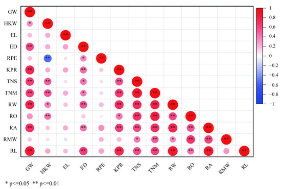 Correlation coefficients between grain yield, N accumulation, and root system traits of six cultivars under three nitrogen (N) conditions. * significant at the 0.05 probability level; ** significant at the 0.01 probability level. GW, Grain weight; HKW, hundred-kernel weight; EL, Ear length; BHL, Bald head length; ED, Ear diameter; RPE, Rows per ear; KPR, Kernels per row; TNS, total N accumulation at silking; TNM, total N accumulation at maturity; RW, root weight; RO, root angle opening; RA, root surface area; RMW, root maximal width; RL, root length.