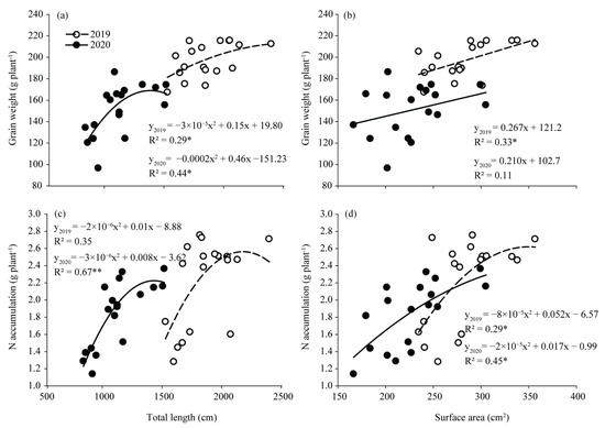 Relationship among total root length, surface area, grain yield, and N accumulation in six maize cultivars under three different N treatments. (a) Relationship between total root length and grain yield, (b) Relationship between root surface area and grain yield, (c) Relationship between total root length and N accumulation, (d) Relationship between root surface area and N accumulation. * significant at p < 0.05, ** significant at p < 0.01.