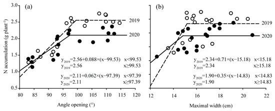 Relationship among angle opening, maximal width, and N accumulation in six maize cultivars under three different N treatments. (a) Relationship between root angle opening and N accumulation, (b) Relationship between root maximal width and N accumulation. The white and black cicles represent the 2019 and 2020 values, respectively.