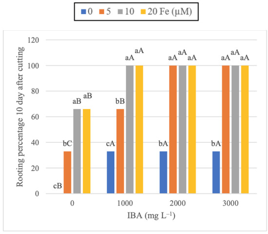 Percentages of rooting 10 days after the rooting induction treatments in Rosmarinus officinalis stem cuttings. Cuttings were treated with different concentrations of IBA (0, 1000, 2000 and 3000 mg L−1) at the start of the experiment and then grown with different concentrations of Fe (0, 5, 10 and 20 µM). Values shown are means ± SE (n = 4 pots). Letters above the columns indicate significant differences at p ≤ 0.05 for the Fe treatments in a given IBA treatment (in lower case) and for the IBA treatments in a given Fe treatment (in capitals).