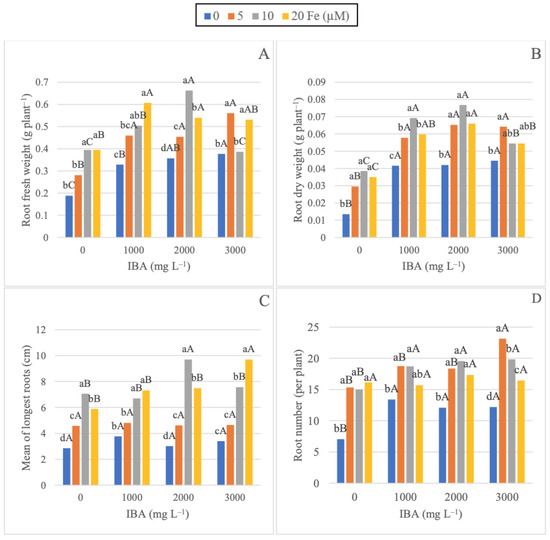 Root parameters 20 days after the rooting induction treatments in Rosmarinus officinalis stem cuttings. Cuttings were treated with different concentrations of IBA (0, 1000, 2000 and 3000 mg L−1) at the start of the experiment and then grown with different concentrations of Fe (0, 5, 10 and 20 µM). Root fresh weight ((A), in g plant−1), root dry weight ((B), in g plant−1), mean of longest roots ((C), in cm) and root number per plant (D). Values shown are means ± SE (n = 4 pots). Letters above the columns indicate significant differences at p ≤ 0.05 for the Fe treatments in a given IBA treatment (in lower case) and for the IBA treatments in a given Fe treatment (in capitals).