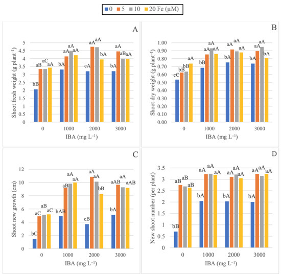 Shoot parameters 20 days after the rooting induction treatments in Rosmarinus officinalis stem cuttings. Cuttings were treated with different concentrations of IBA (0, 1000, 2000 and 3000 mg L−1) at the start of the experiment and then grown with different concentrations of Fe (0, 5, 10 and 20 µM). Shoot fresh weight ((A), in g plant−1), shoot dry weight ((B), in g plant−1), shoot new growth ((C), in cm), and new shoot number per plant (D). Values shown are means ± SE (n = 4 pots). Letters above the columns indicate significant differences at p ≤ 0.05 for the Fe treatments in a given IBA treatment (in lower case) and for the IBA treatments in a given Fe treatment (in capitals).