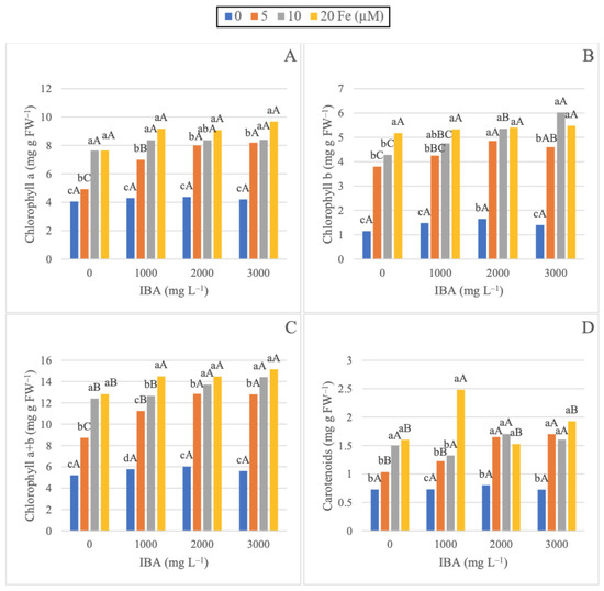 Leaf photosynthetic pigment concentrations 20 days after the rooting induction treatments in Rosmarinus officinalis stem cuttings. Cuttings were treated with different concentrations of IBA (0, 1000, 2000 and 3000 mg L−1) at the start of the experiment and then grown with different concentrations of Fe (0, 5, 10 and 20 µM). Chlorophyll a (A), chlorophyll b (B), total chlorophyll (C), and carotenoid (D) concentrations. Values shown are means ± SE (n = 4 pots). Letters above the columns indicate significant differences at p ≤ 0.05 for the Fe treatments in a given IBA treatment (in lower case) and for the IBA treatments in a given Fe treatment (in capitals).