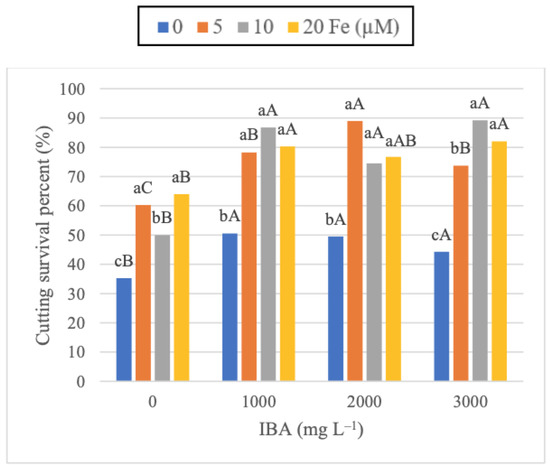Survival (in %) of Rosmarinus officinalis stem cuttings 10 days after transfer to a sand:soil mixture. Cuttings were treated with different concentrations of IBA (0, 1000, 2000 and 3000 mg L−1) at the start of the experiment, then grown for 20 days with different concentrations of Fe (0, 5, 10 and 20 µM) and finally transplanted to the sand:soil mixture. Values shown are means ± SE (n = 4 pots). Letters above the columns indicate significant differences at p ≤ 0.05 for the Fe treatments in a given IBA treatment (in lower case) and for the IBA treatments in a given Fe treatment (in capitals).
