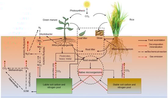 Schematic diagram of carbon and nitrogen cycles and functions of green manure in a green manure and rice rotation system.