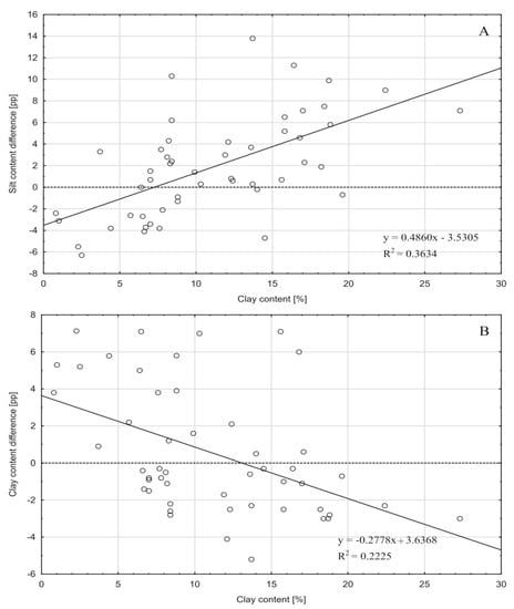 The change (value after SOM removal—value before SOM removal) in the sand fraction as a result of SOM removal was positively correlated with its initial content and negatively correlated with the initial contents of silt and clay. These correlations were statistically significant at p < 0.05. The change in silt content was, in turn, negatively correlated with the initial sand content and positively correlated with the initial silt and clay contents. These correlations were statistically significant at p < 0.05. For the change in silt content and initial clay content, the correlation coefficient was 0.6029 and the linear regression equation had the form y = 0.4860x − 3.5305 (increasing trend). Furthermore, the change in clay content due to SOM removal was negatively correlated with initial clay content. These correlations were statistically significant at p < 0.05. The correlation coefficient for these two quantities was 0.4717, and the linear regression equation had the form y = −0.2778x + 3.6368 (decreasing trend). Thus, in light soils (sandy, containing <10% clay fraction), the process of SOM removal caused an increase in the clay fraction at the same time as a decrease in the silt fraction. On the other hand, in soils with a higher initial clay fraction (medium and heavy soils, containing >10% clay), the SOM removal process caused a decrease in the clay and sandy fractions, while the silt fraction increased (Figure 1). A correlation between changes in the three fractions as a result of SOM removal and the initial SOC content of the soil samples was also tested. It was found that there was a negative, statistically significant correlation for the sand fraction (r = –0.3718, p = 0.008) and a positive correlation for the silt fraction (r = 0.3171, p = 0.025).