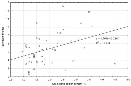 The Euclidean distance was used to provide an overall assessment of the influence of the SOM removal process on the results of the dynamometer method. In this study, the distance was between points in a three-dimensional space describing the particle size distribution through three parameters (the sand, silt, and clay fractions). The points represented the differences between these fractions in samples with and without SOM. The Euclidean distance thus calculated for the 50 samples ranged from 0.6 to 17.1%, with a mean value of 6.6% and a standard deviation of 3.6%. The Euclidean distance between the means of the different fractions calculated before and after SOM removal was also determined, and found to be 3.1%, with the ratio of the two values being 2.13 (2.13 = 6.6%/3.1%). Thus, it can be concluded that, while the individual sample results sometimes changed significantly during the SOM removal process, the change in the means of the different fractions was much smaller. In other words, the changes in the different fractions were irregular and did not show an overall trend. The Euclidean distance was found to be correlated with the organic matter content of the samples. These correlations were statistically significant (r = 0.3998 and p = 0.004) (Figure 2).