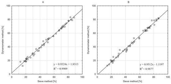 Using this regression model [,], for the samples with SOM, the equation y = 0.9367x + 1.6203 was obtained (determinations as above), and the TSS value was 111.6. The average for one measurement was 2.232. For the samples after SOM removal, the regression line determined by the RMA method was described by the equation y = 0.9571x − 1.4117, and the TSS value was 158.7. The average TSS for one measurement was 3.175. In both cases, agreement between the sieve and dynamometer determinations was high, with similar values, and only slightly affected by the SOM removal process.