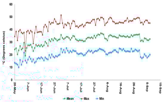 Temperature trend recorded during the growing season from May to September under greenhouse conditions: maximum, minimum, and mean temperature (°C).