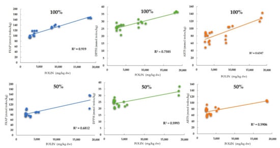 In Figure 2, the correlation between the total phenolic content (Folin) and each of the antioxidant capacity methods in both water regimes is shown.