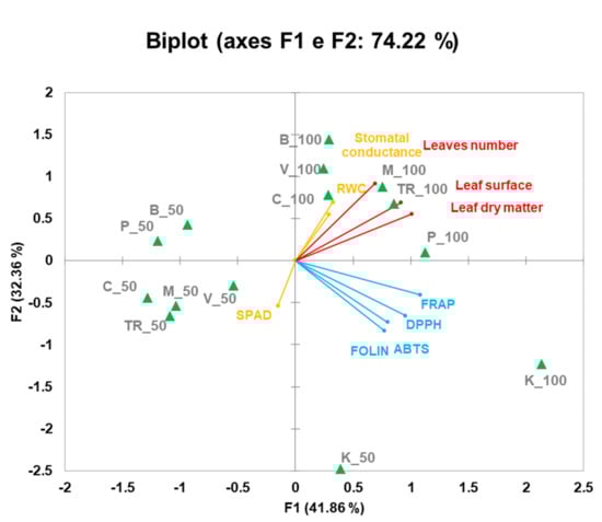 A principal component analysis (PCA) was done to feature the repercussion of the biostimulant treatments on the biometric, eco-physiological and qualitative parameters analyzed above. The first two principal components (PCs) disclosed 74.22% of the cumulative variance (Figure 3), with PC1 detailing for 41.86% and PC2 for 32.36%.