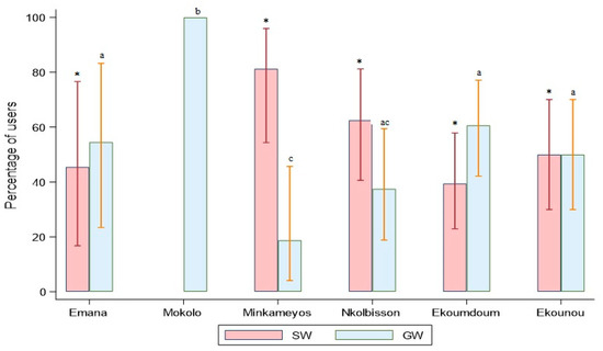 The percentage of Mokolo farmers using GW for irrigation was significantly higher than in the other studied areas of Yaoundé. On the contrary, the percentage of farmers from Minkoameyos using GW for irrigation was significantly lower than those from the Emana, Ekounou, and Ekoumdoum sites.