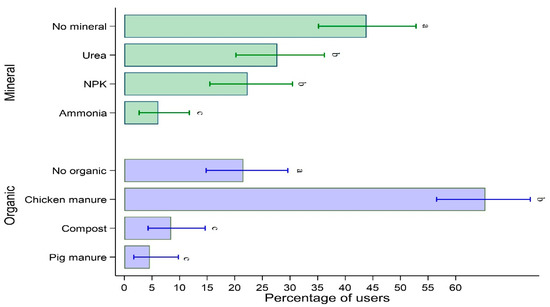 Types of fertilizers used in Yaoundé lowlands (No mineral: farmers use only organic fertilizers; No organic: farmers use only mineral fertilizers; same letter for the respective fertilizer types are not significantly different at p < 0.05 at 95% exact confidence intervals).