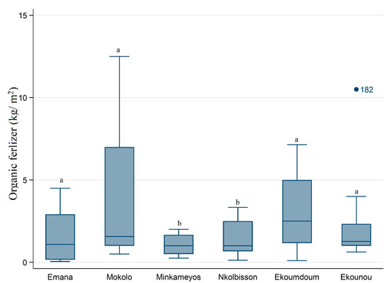 Box plot showing the distribution of the amount of organic fertilizer used per m2 in the studied areas. (Same letters indicate no significant differences at p < 0.05; data are shown using box whisker plot to reveal the heteroscedasticity; the significance indicator refers to a robust generalized linear model).